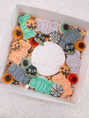 - 1x white round 7x7cm cm “trick or treat” cookie